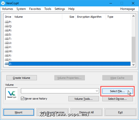 在VeraCrypt主窗口上,选择要用于卷的未使用的驱动器号。检查“文件资源管理器"以查看当前正在使用的驱动器号,并避免使用它们。