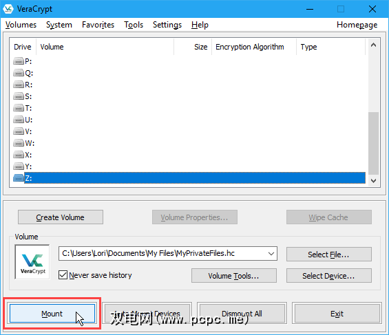 要访问该卷,请在VeraCrypt中双击该驱动器号。