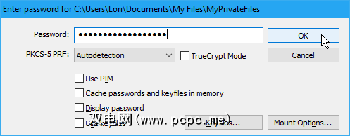 输入您的密码。如果您还记得创建卷时选择的哈希算法,请从 PKCS-5 PRF 下拉列表中选择它。如果没有,请放心。您可以使用默认的自动检测。卷可能需要更长的时间才能解密和挂载。