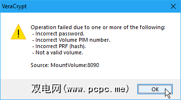 如果您输入了错误的密码或忘记了选择密钥文件(如果在创建该卷时使用了它们),则会看到以下错误对话框。单击确定,返回到输入密码对话框,然后输入正确的密码并选择正确的密钥文件(如果使用了它们)。