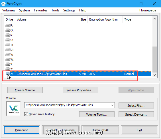 VeraCrypt卷文件的路径显示在下拉列表框中。