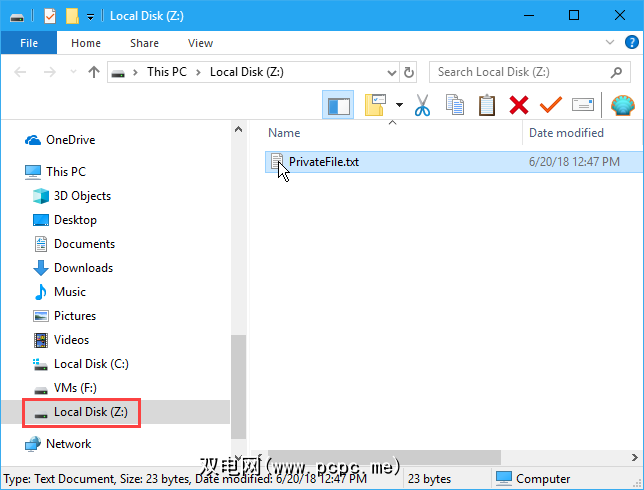 您也可以像通常浏览其他任何类型的驱动器一样,在文件资源管理器中浏览到已装入的卷。例如,我们使用驱动器号 Z:挂载了VeraCrypt卷,并在文件资源管理器中显示了该驱动器号。