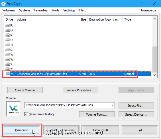 在处理完VeraCrypt卷中的文件后, ,您可以关闭或卸载该卷。