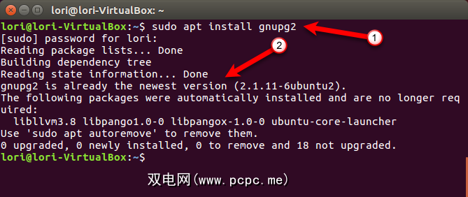 通过按 Ctrl + Alt + T 打开“终端"窗口,然后运行以下命令来安装GnuPG 2。如果已经安装了GnuPG 2,系统将告诉您。否则,将安装GnuPG: