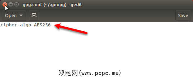 gedit ~/.gnupg/gpg.conf最初, gpg.conf 文件不存在。但是运行上面的命令将创建文件。您将在gedit中看到一个空文件。我们想要将默认密码算法更改为 AES256 ,因此将以下行添加到文件中。