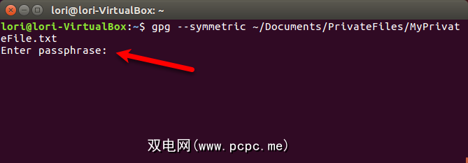 gpg --symmetric ~/Documents/PrivateFiles/MyPrivateFile.txt系统将要求您输入密码,然后重复相同的密码。确保使用了强密码短语,以免忘记它。