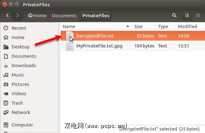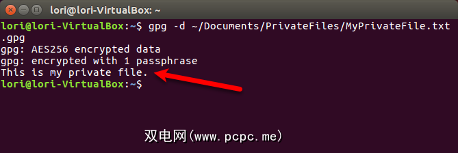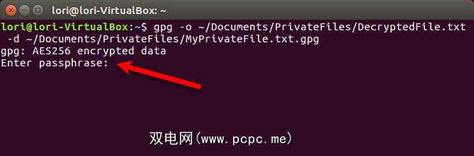 gpg -o ~/Documents/PrivateFiles/DecryptedFile.txt -d ~/Documents/PrivateFiles/MyPrivateFile.txt.gpg您可以将〜/ Documents / PrivateFiles / DecryptedFile.txt 路径和文件名更改为要用于解密文件的任何路径和文件名。