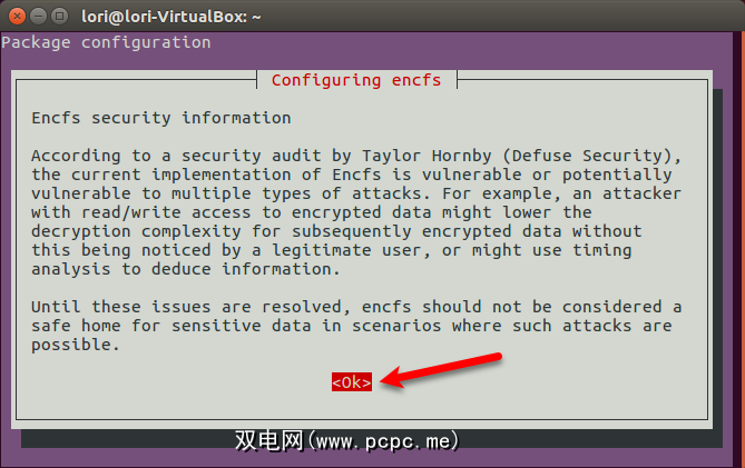 下面的对话框显示,其中包含有关Encfs中安全性的警告。 2014年的安全审核发现了Encfs中的某些漏洞。这些漏洞不容易利用,但确实会导致Encfs并非“军事级"安全。