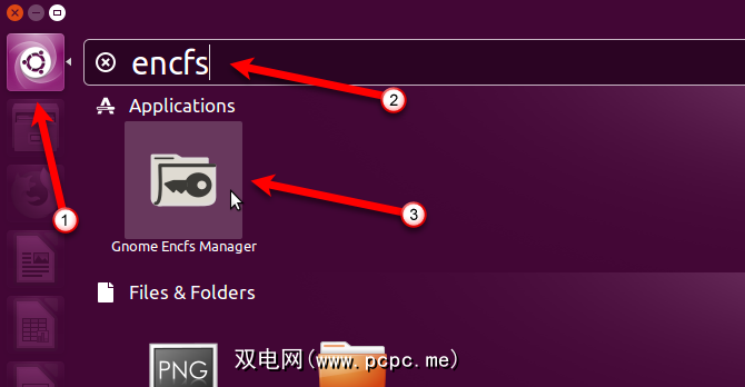 要运行该程序,请单击Unity栏上的搜索您的计算机按钮,然后输入 encfs 。当您在应用程序下看到Gnome Encfs Manager图标时,请单击它。
