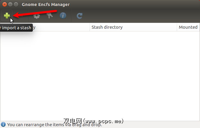 出现Gnome Encfs Manager主窗口。要创建新的存储,请单击工具栏上的加号图标。