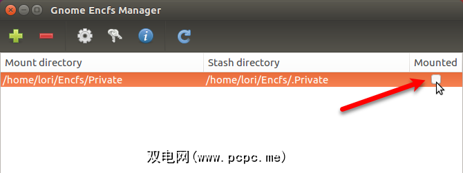 要卸载加密的文件夹,请在Gnome Encfs中取消选中该文件夹的 Mounted 框。管理器窗口。