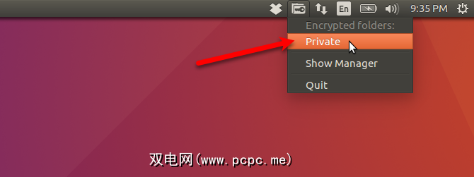 您还可以在顶部面板的托盘中访问Gnome Encfs Manager。 Show Manager (显示管理器)选项将打开GencfsM主窗口。托盘菜单还允许您安装和卸载现有存储。