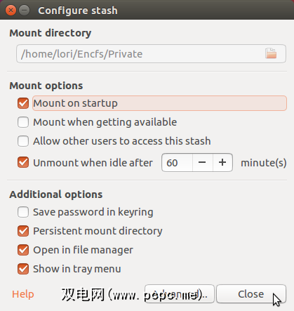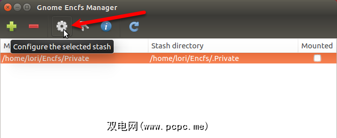 Each stash can be configured separately. To configure a stash, select it in the list on the main Gnome Encfs Manager and click the Configure the selected stash (gear) button on the toolbar.