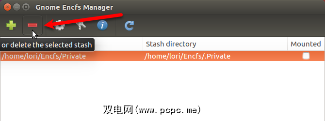 如果已完成存储的操作,则可以将其删除。打开Gnome Encfs Manager主窗口,然后选择要删除的存储区。然后,单击工具栏上的减号图标。