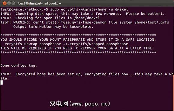 完成后,您将需要重新登录到原始用户的帐户,并按照显示的说明添加密码来完成加密过程到新加密的文件夹。如果未出现,则可以在终端中键入
