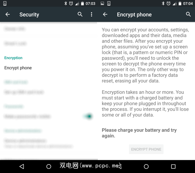 要加密您的Android设备,您应该已经如上所述设置了PIN。您还需要将手机连接到充电器,因为加密过程需要大量电池。进入设置>安全性>加密>加密电话。阅读警告/解释,并确保对加密的含义感到满意。满意后,点击加密电话,然后执行其他操作。在加密过程中,您的电话将专用于该任务,因此您将无法拨打电话,运行应用程序,查看电子邮件等。