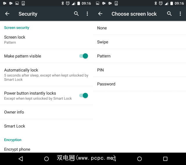 这两个锁是有用的,但对于最佳锁定在设备安全方面,您应该引入加密,这是保护设备上数据的最安全方法。毕竟,即使小偷无法猜出四位数的PIN或遵循电话屏幕上油腻的拇指留下的图案,他或她仍将能够收集大量的个人信息通过将USB电缆插入Android智能手机并使用PC读取存储空间。