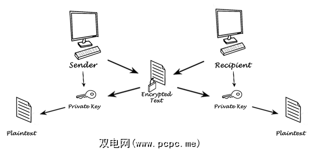 其中,私钥或对称加密不同于公钥加密,以按键本身为目的。仍然需要两个密钥来进行通信,但是每个密钥现在基本上是相同的。