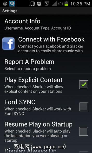Slacker Radio also includes a wealth of preferences for you to mess around with. You can connect Slacker to your Facebook account, allow explicit content to be played, enable Ford SYNC support, resume playback on startup, keep the screen on while Slacker is open, enable wireless refresh, adjust audio quality, preload tracks, and configure headline news and ESPN updates. Essentially, these settings go into a good amount of detail, and it’s great to see Slacker support some interesting technologies such as Ford SYNC.