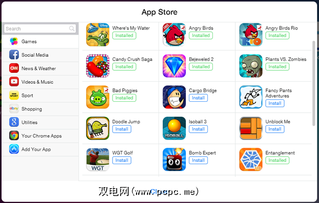 新标签页带有“ App Store",您可以通过该页面将更多的网站图标添加到您的首页。这个App Store看起来很像Apple的商店,并且包含许多选项供您选择。如果您想知道不同的游戏,那么这些会将您引向浏览器中原始游戏的Flash版本。