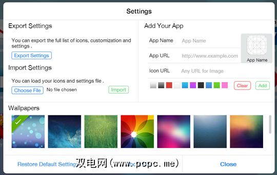 从设置中,您可以通过选择iOS 7 ish壁纸之一并添加您的图片来控制新标签页的外观。自己的网站带有自定义图标。您可以导出和导入设置和图标,从而在多台不同的计算机上使用它们。