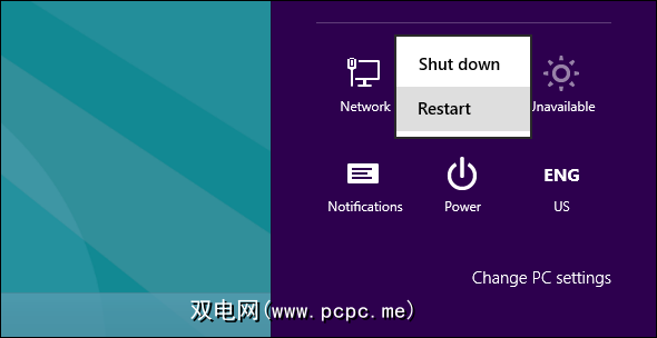 在Windows 8.1中,步骤略有不同。在“ PC设置"中,导航到“ 更新和恢复"标签,然后转到“ 恢复",最后单击“高级启动"下的立即重新启动。