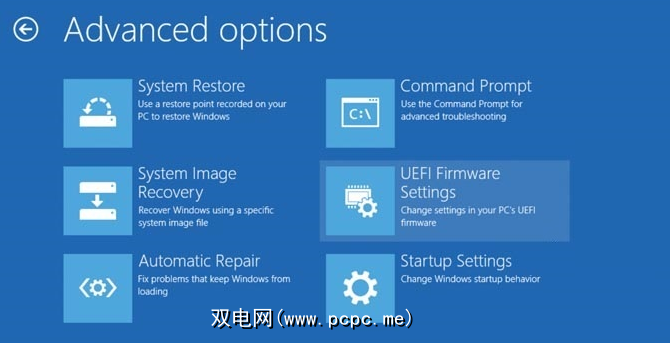 使用高级启动重新启动时,首先需要选择启动选项。在出现的屏幕上,转到故障排除>高级选项> UEFI固件设置,然后单击重新启动,这将从Windows 10直接启动到UEFI BIOS。