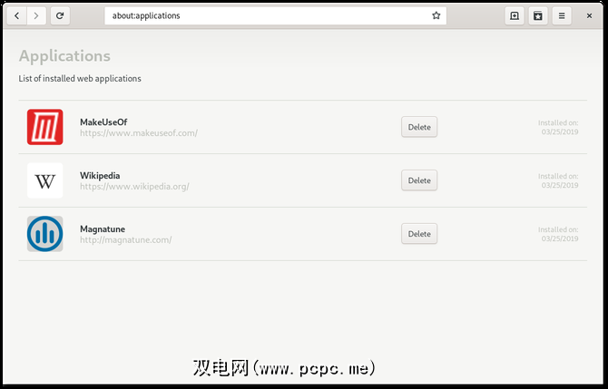 GNOME Web带有一个简单但功能强大的应用程序管理器。浏览器的这一部分显示了您创建的Web应用程序,并提供了将其删除的选项。这至关重要,因为台式机通常无法提供直观的方式来卸载Web应用程序。