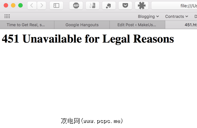 “出于法律原因不可用"有点委婉说法-该错误的原因是表示政府审查制度。 451 Unavailable运动背后的组织希望互联网服务提供商(ISP)在政府强迫他们阻止特定网站或页面时会显示此错误。目前,很难或根本无法确定何时发生这种情况,因为ISP通常会出现403禁止的错误,该错误不会告诉您任何您看不到该站点的原因。