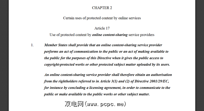 与许多法律文件一样,目前尚不清楚这意味着什么。但是,总而言之,任何处理用户上载内容的互联网服务(占所有在线服务的大部分)都有责任确保未将受版权保护的资料非法显示或上传到其平台上。