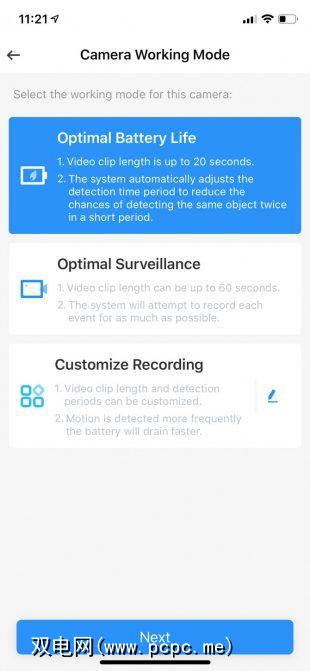 设置摄像机时,您还将选择操作模式:最佳的电池续航时间(20秒录制,不频繁),尽可能最佳的录制(最多60秒,更频繁),或者可以自定义设置。