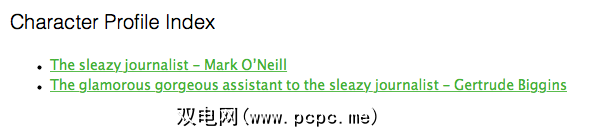 为您的角色使用Evernote的另一个好理由是,您可以创建所有角色的索引个人资料。这样,您不必进行太多搜索。只需单击您需要的链接,您就会被直接带到那里。