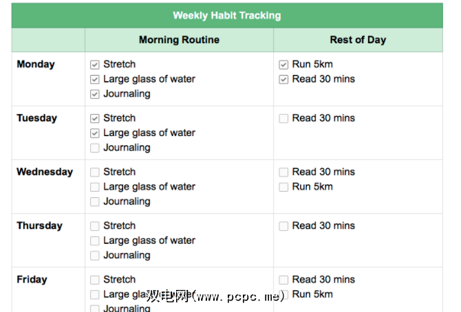 上面的表格是只是一个示例,可以帮助您在一周的时间内跟踪习惯。