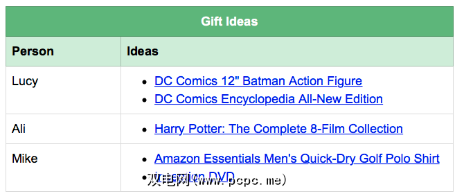 创建这样的列表,并且每当遇到某些您认为对特定人员来说都是不错的礼物时,请将其添加到他们的姓名旁边。这样,您将永远不会再用完礼物创意!