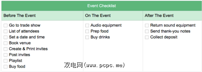上面的清单显然过分简化了。如果您要举行婚礼,则清单将是此大小的10倍。但是该概念适用于大多数规模的事件。将您的任务分解为在事件发生之前,之中和之后要做的事情,您不会出错!
