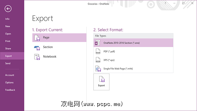OneNote的选择要灵活得多。您可以选择是要导出当前页面,当前部分还是整个当前笔记本。对于每个选项,可以以PDF,XPS,MHT或OneNote特定格式进行导出。
