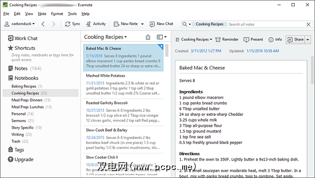OneNote刚开始感觉很奇怪,需要一段时间才能适应,但我个人认为这是更直观,有利于提高生产力。我还认为,尽管您的里程可能会有所不同,但OneNote在我使用了几年的笔记本电脑上比Evernote更具响应性(阅读:没有那么懒惰)。时间。每个笔记本电脑的顶部都有选项卡以区分各个部分,每个部分的侧栏中都带有选项卡以区分页面。要切换笔记本吗?只需使用左上方的下拉选择器即可。