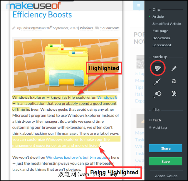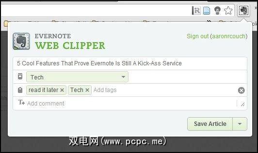 突出显示文章各部分的功能是剪辑文章时急需的功能。如果您完全熟悉Diigo的Web工具栏,则知道它们具有便捷的注释工具。 Evernote Web Clipper不仅专注于研究工具,因此这可能就是为什么它尚未为文章视图实现许多注释功能的原因。但是,荧光笔是一个不错的开始,并且在记住文章的各个方面时肯定非常有用。