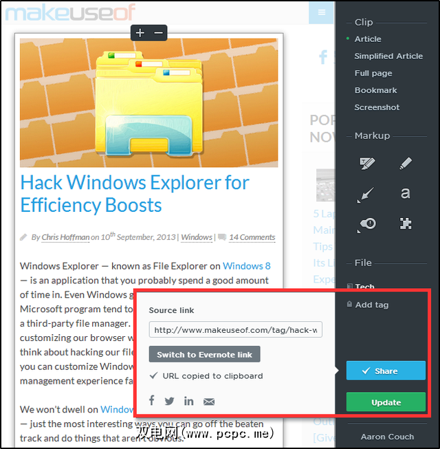 将多个任务组合成一个任务总是很不错的,因此,如果您想共享也要剪切的内容,那么现在就可以直接从Web Clipper界面进行操作。单击 Share 按钮后,URL将自动复制到键盘。还会显示源链接,但是您也可以切换到Evernote链接并使用它。有Facebook,Twitter,LinkedIn和电子邮件共享按钮。