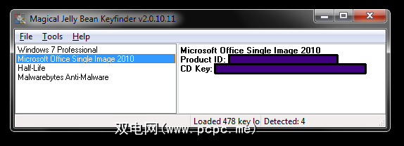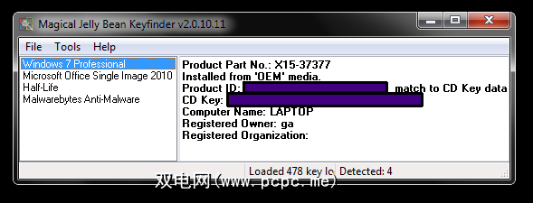 如果您使用的是Windows的早期版本,Magical Jelly Bean Keyfinder将显示您在安装过程中使用的产品密钥。例如,下图显示了该程序在Windows 7中的运行。