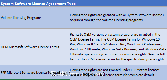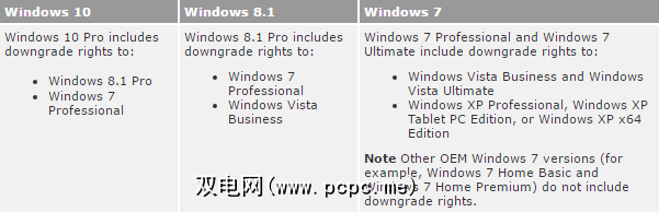 上表中许多内容的关键文章是缺少零售许可证的降级权利。如果您具有针对单个操作系统的专门购买的许可证,则将使用该许可证。拥有OEM许可证的用户可以从一系列降级选项中进行选择:
