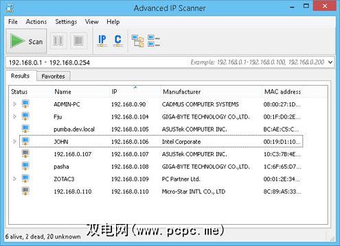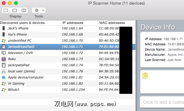 您可能还希望使用图形界面来浏览联网的计算机。对于OS X,我建议使用IP扫描仪主页。它具有制造商的内置数据库,因此发现设备后,它会进行探查以查看是否可以自动识别设备的类型(并分配一个可爱的小图标以方便识别)。