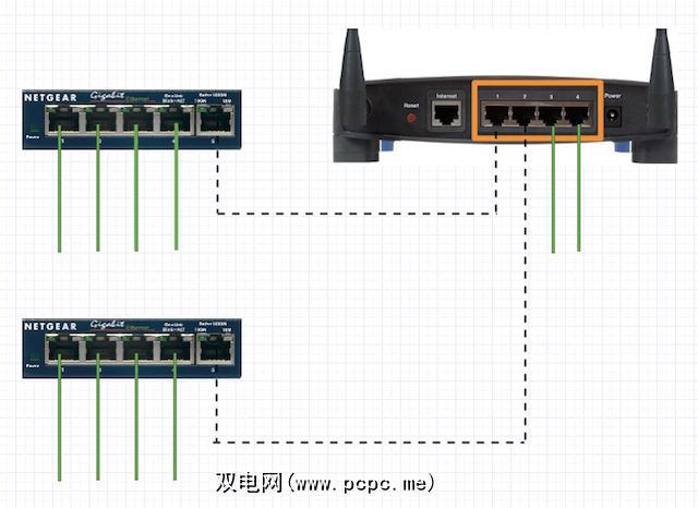 如果您需要再次扩展,最好使用路由器上的原始端口之一–虽然可以将菊花链式交换机连接在一起,但每次都会引入少量延迟。如果由于路由器太远而没有其他选择,则采用菊花链式连接一到两次还是比其他技术(例如Wi-Fi或电力线)更好。
