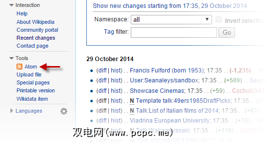 每篇Wikipedia文章都有一个RSS feed,尽管这不是立即显而易见的。要查找文章的Atom提要,请转到左侧边栏中的“交互"部分。在此处,选择“相关更改"。然后,您将看到对该文章进行的所有更改。现在再次查看左侧边栏。在“工具"下,您将看到供稿: