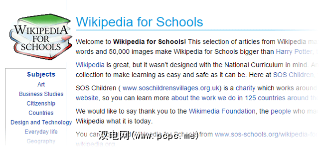 学校维基百科是维基百科的改编版,适用于学习英国国家课程的学生。根据其网页,它由“ 6,000篇文章,2,600万个单词和50,000个图像"。它由慈善机构SOS Children编写,旨在帮助世界各地有需要的儿童。