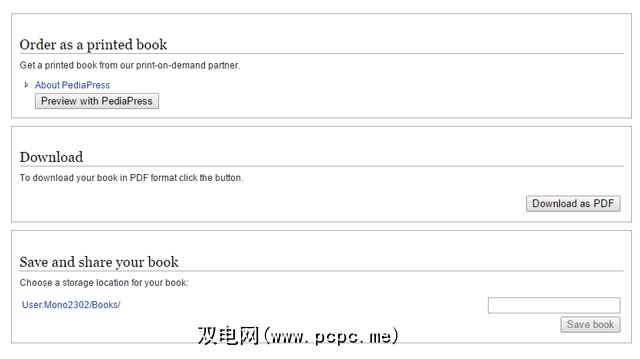 然后,您可以在右侧选择要执行的操作-订购印刷书籍,下载PDF或将其存储在Wikipedia帐户中。