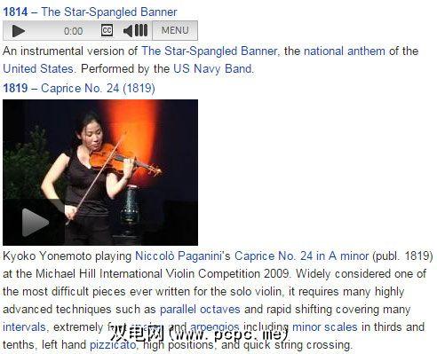 精选功能声音部分包含被认为是“维基百科上最好的声音"(截至2011年11月)。您可以流式传输所有曲目;还有一部关于小提琴的视频。如果您真正喜欢的东西,可以将其下载到计算机上。