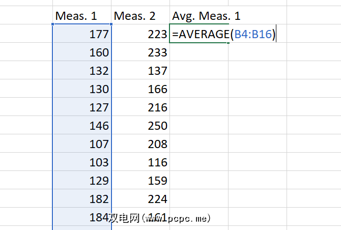 在我们的示例中,我们需要一系列测量值的平均值。我们将单击一个新的单元格,然后输入 = AVERAGE(),然后使用鼠标选择相关的单元格(如果需要,您也可以在单元格区域中键入)。一个),您将拥有一个类似于以下内容的公式: = AVERAGE(B4:B16)