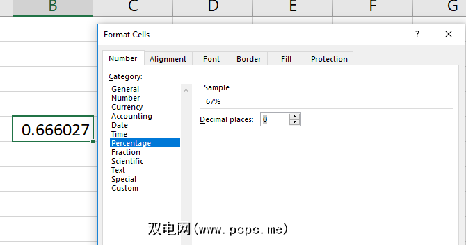 您现在有了一个十进制值(在这种情况下为.67)。要将其转换为百分比,请按键盘上的 Ctrl + Shift + 5 (这是添加到武器库中的非常有用的Excel键盘快捷键)。