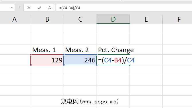 现在,取结果值(原始更改)并将其除以原始值测量。在我们的例子中,这是 = 117/129 。这使我们的十进制变化为0.906。您还可以通过一个公式来获取所有这些信息,例如: